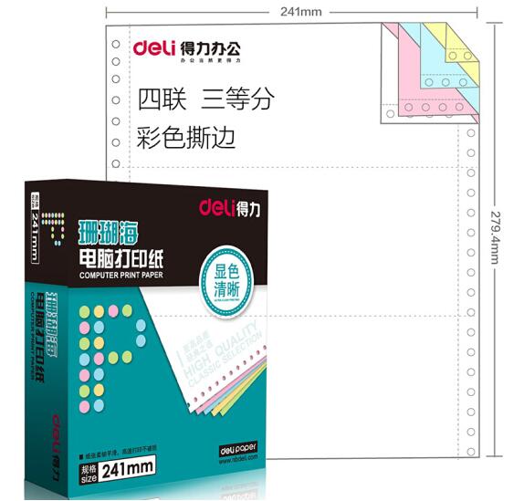 • 商品名称:得力(deli)珊瑚海彩色电脑打印纸S241-4-1/3CS四联三等分80列(撕边 色序:白红蓝黄 1000页/箱)