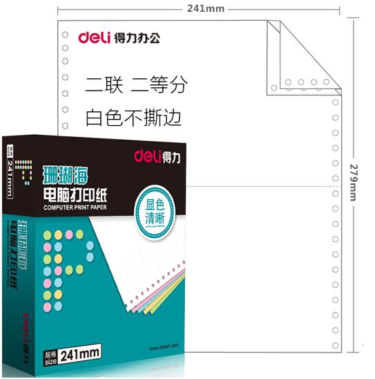 • 商品名称:得力(deli)珊瑚海S241-2-1/2二联二等分整张电脑打印纸80列白色不撕边 1000页/箱