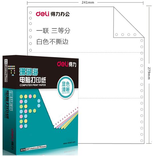 • 商品名称:得力(deli)珊瑚海S241-1-1/3一联三等分80列不撕边 白色电脑打印纸 1000页/箱