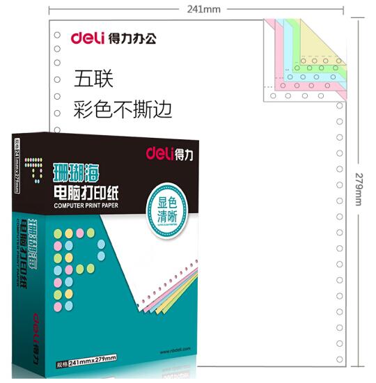 • 商品名称:得力(deli)珊瑚海S241-5C五联彩色电脑打印纸整张80列(不撕边 色序:白红蓝绿黄 1000页/箱)