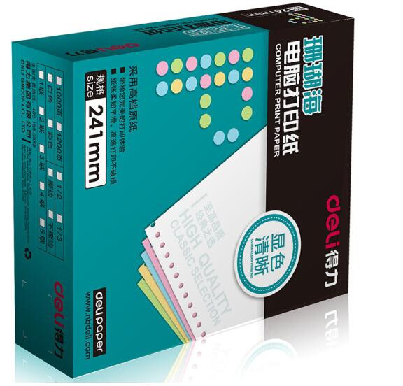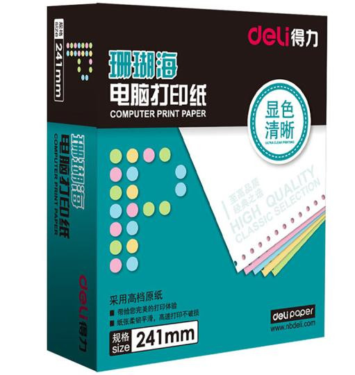• 商品名称:得力(deli)珊瑚海彩色电脑打印纸S241-3CS三层80列(撕边 色序:白红黄 1000页/箱)