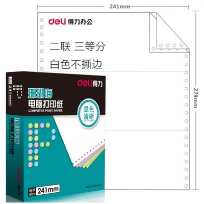 • 商品名称:得力(deli)珊瑚海S241-2-1/3二联三等分80列不撕边 白色 电脑打印纸 1000页/箱